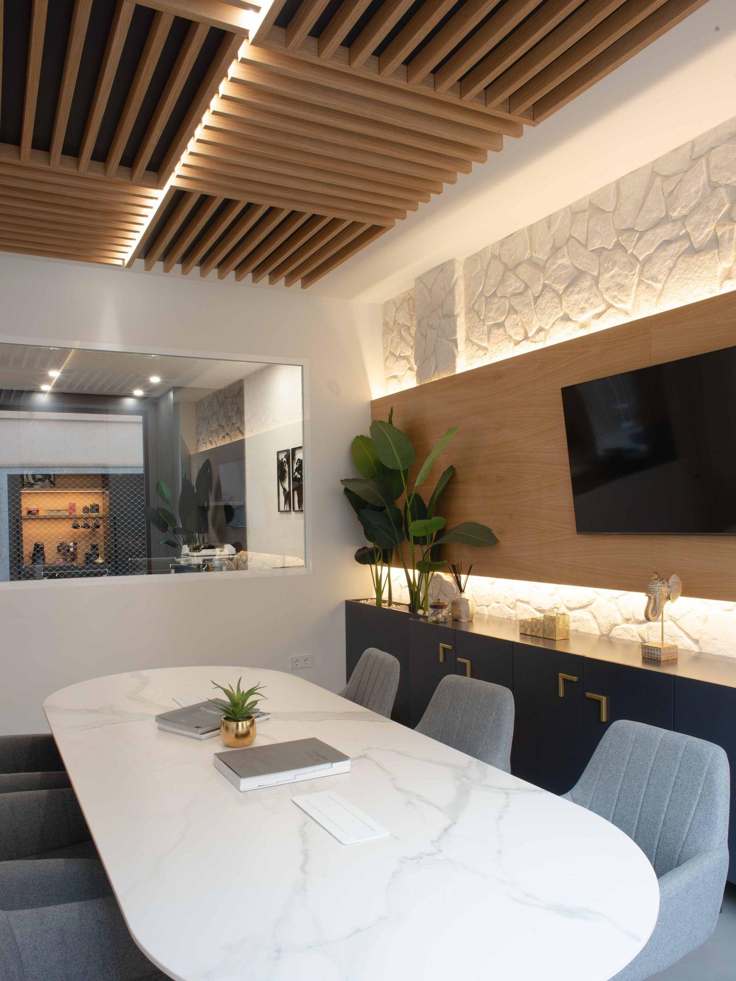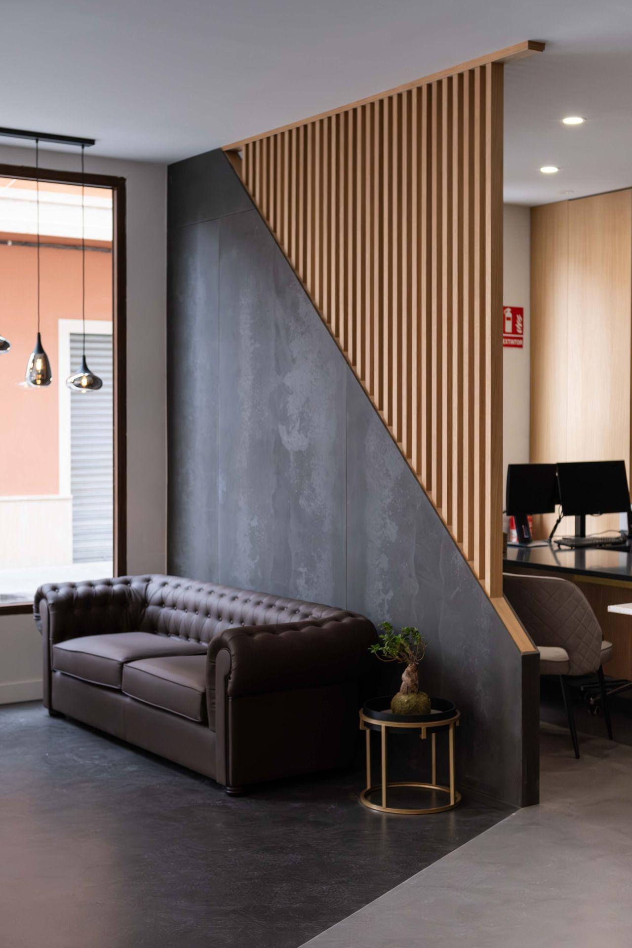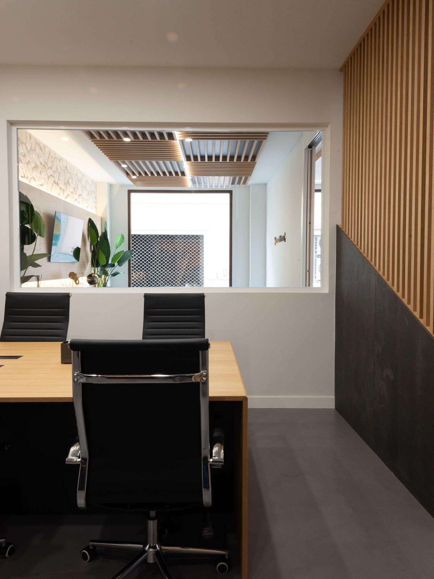 Elementos distintivos como los panelados de lamas de madera y la iluminación integrada realzan las texturas y aportan dinamismo al conjunto. Cada área, desde la zona de recepción con su sofá Chester, hasta los espacios de trabajo y reunión, ha sido concebida para fomentar la productividad y el bienestar, donde la estética refuerza una experiencia de cliente de alto nivel.