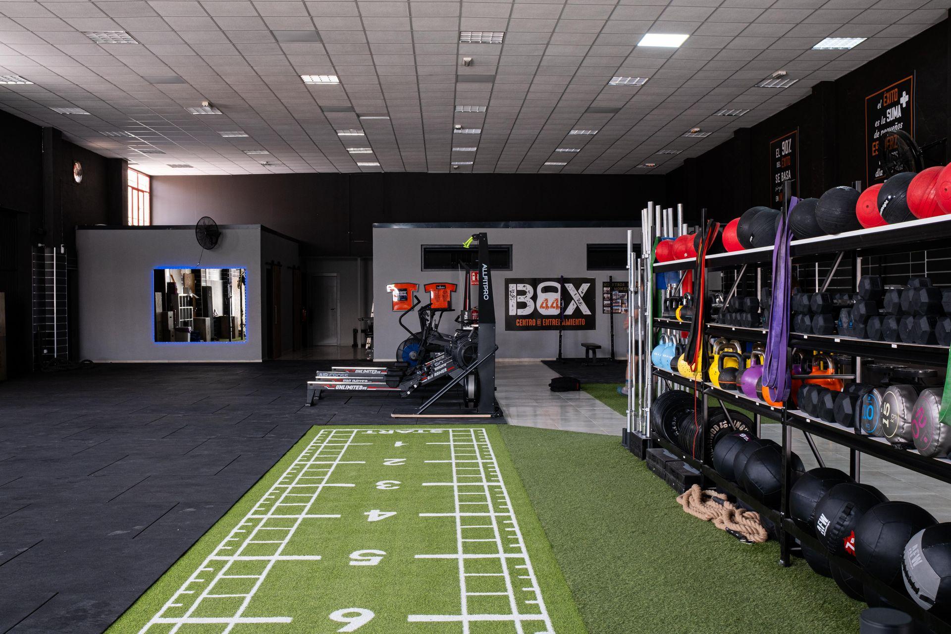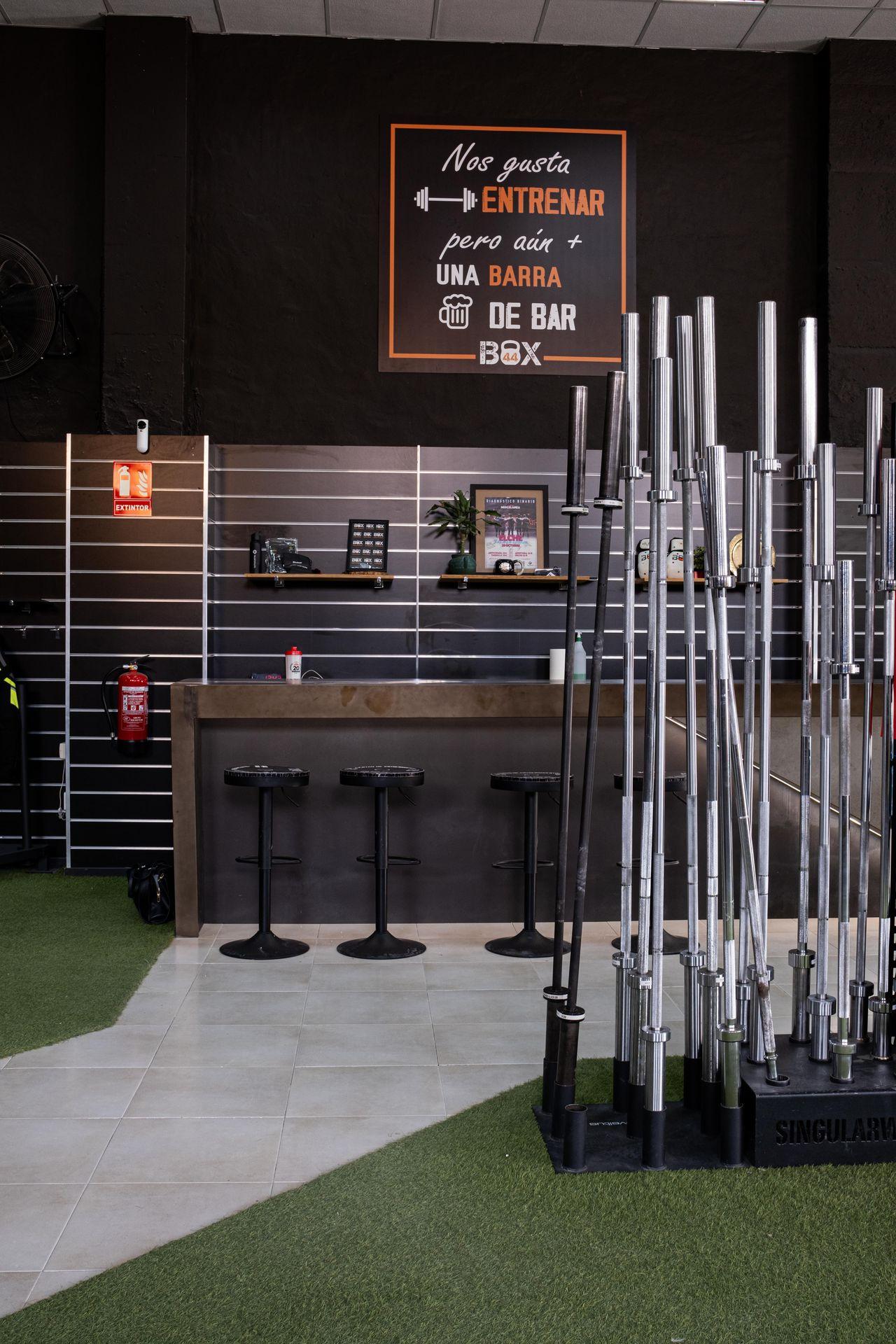 Las zonas de ejercicio están claramente delimitadas con diferentes tipos de suelo, desde el césped artificial hasta el caucho, optimizando cada rincón para la actividad física. Elementos gráficos y frases inspiradoras en las paredes, junto a un área de barra para la interacción social, refuerzan un ambiente comunitario y de superación, haciendo de cada visita una experiencia completa.