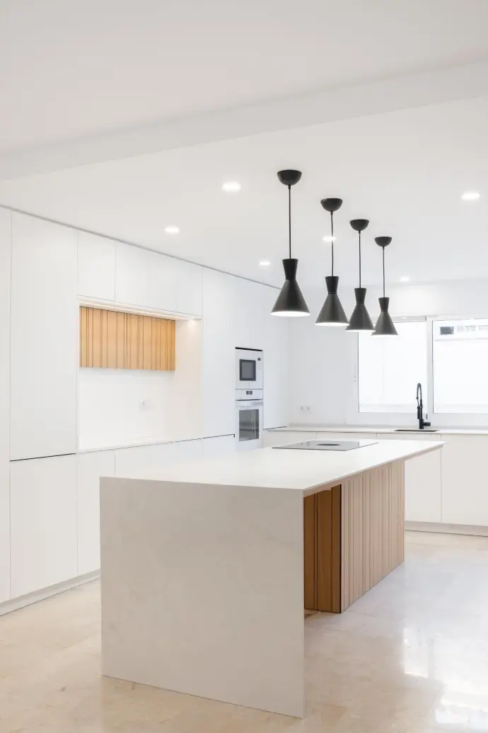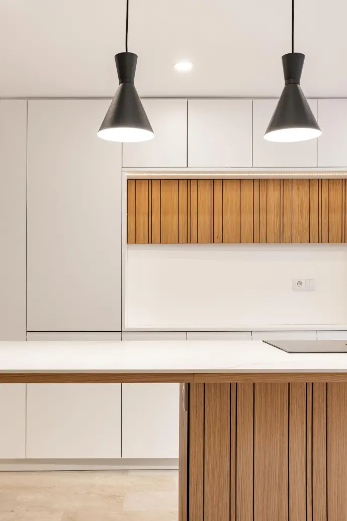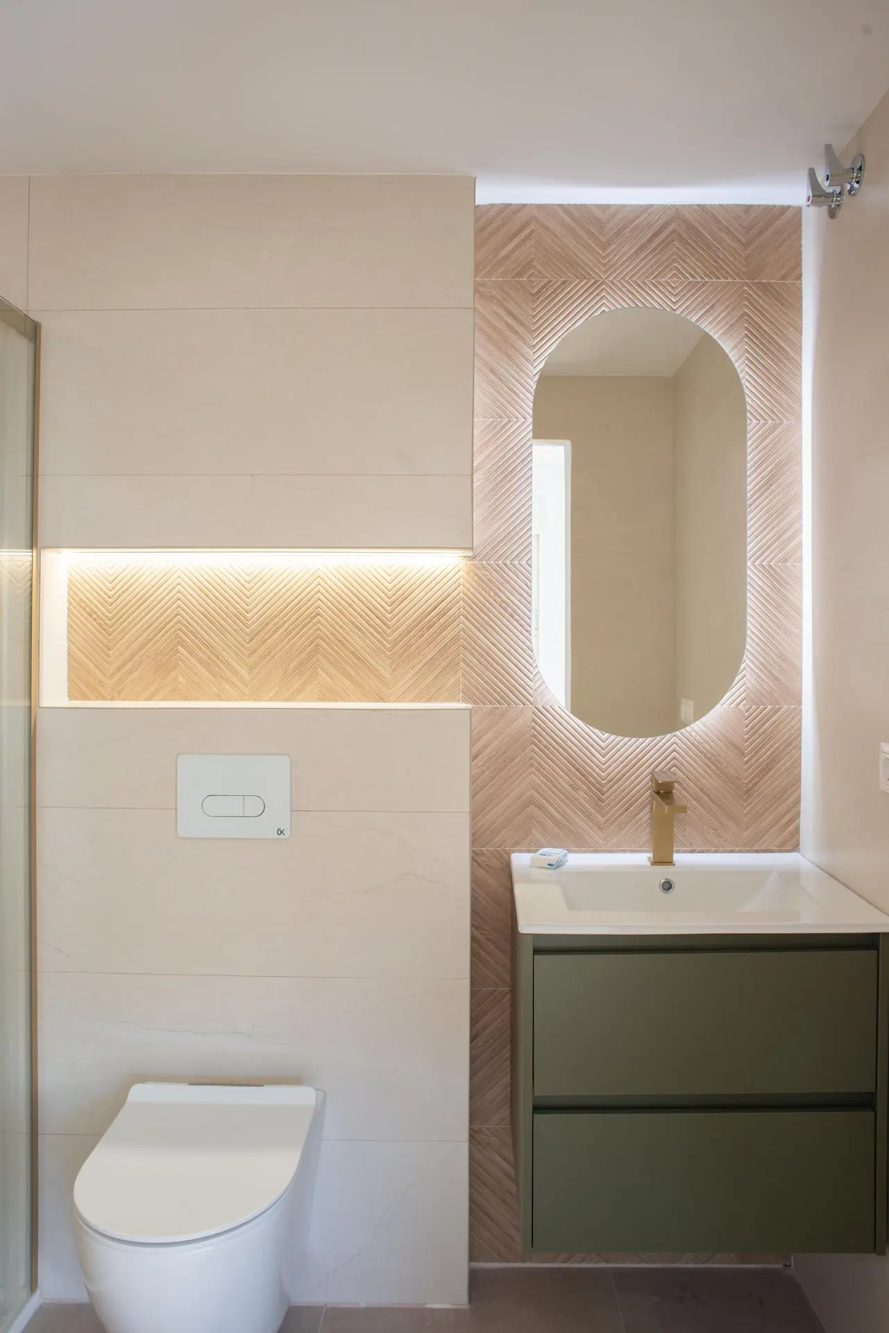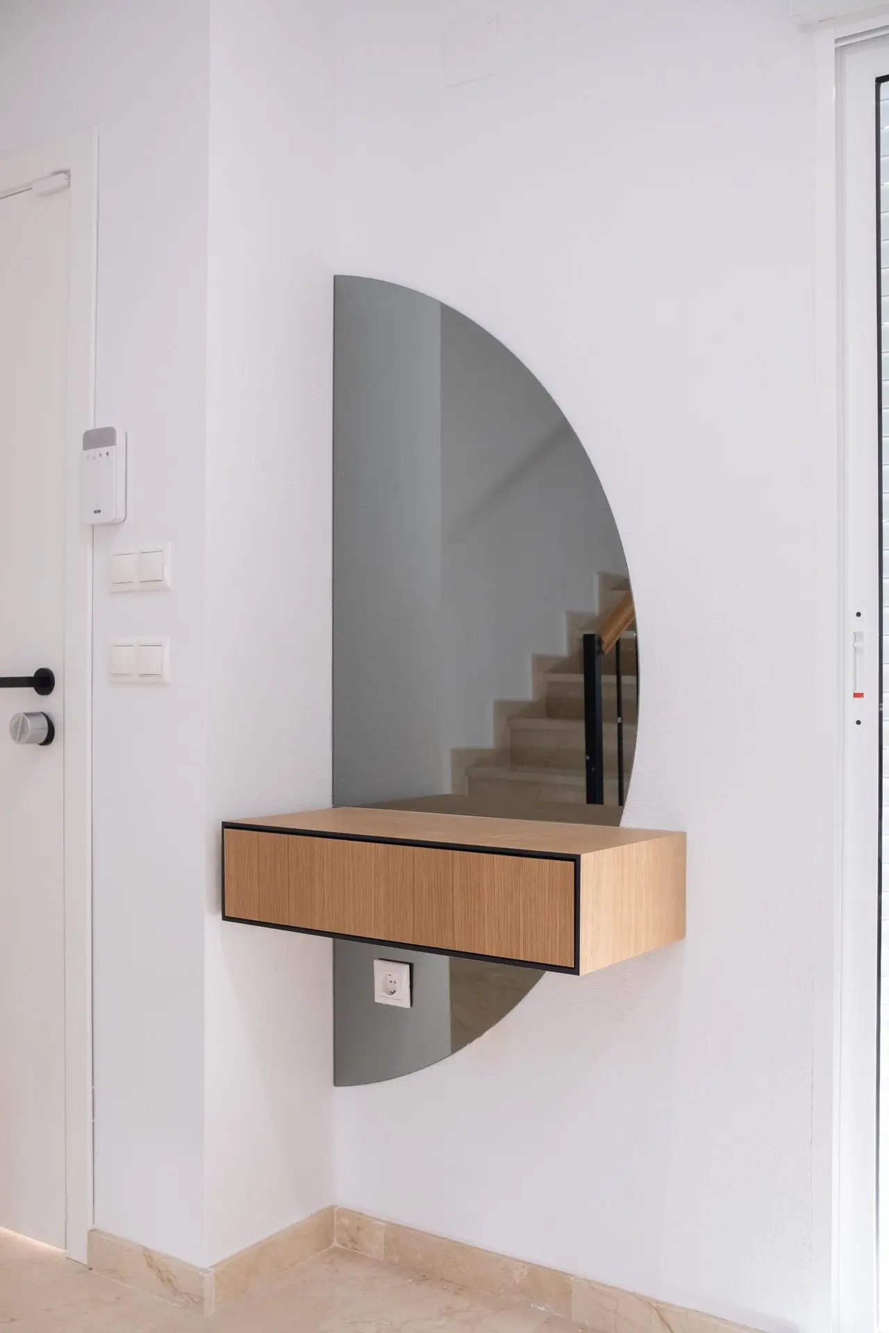 Detalles como la isla de cocina con su revestimiento de lamas, las lámparas colgantes de diseño minimalista y el espejo semicircular del recibidor añaden un toque distintivo. El baño, con sus azulejos con textura y espejo retroiluminado, muestra una atención al detalle que eleva la experiencia. Es un hogar donde cada elemento ha sido escogido para crear un ambiente armonioso, práctico y lleno de estilo.