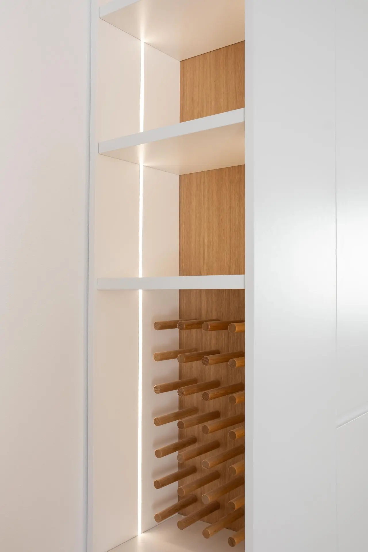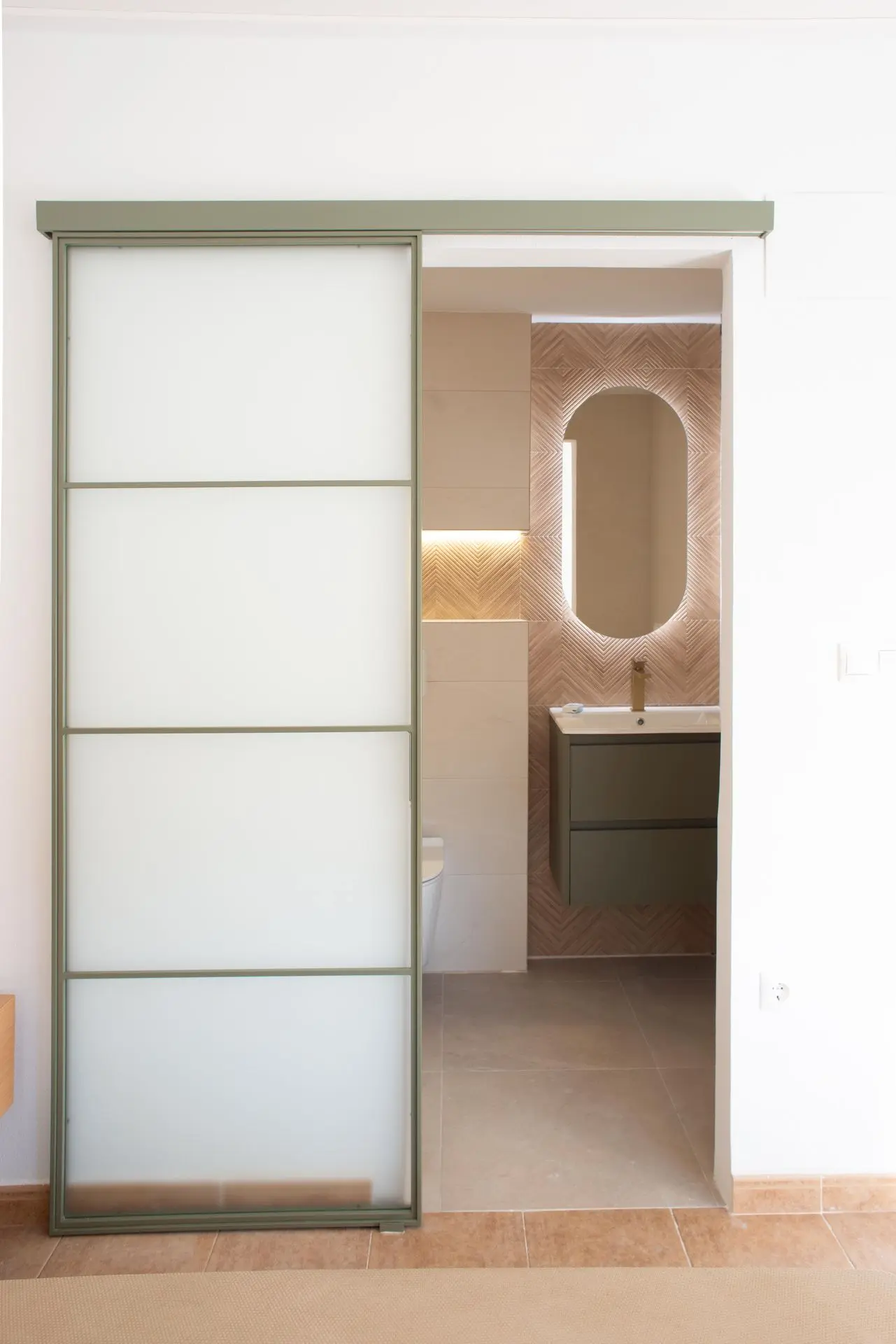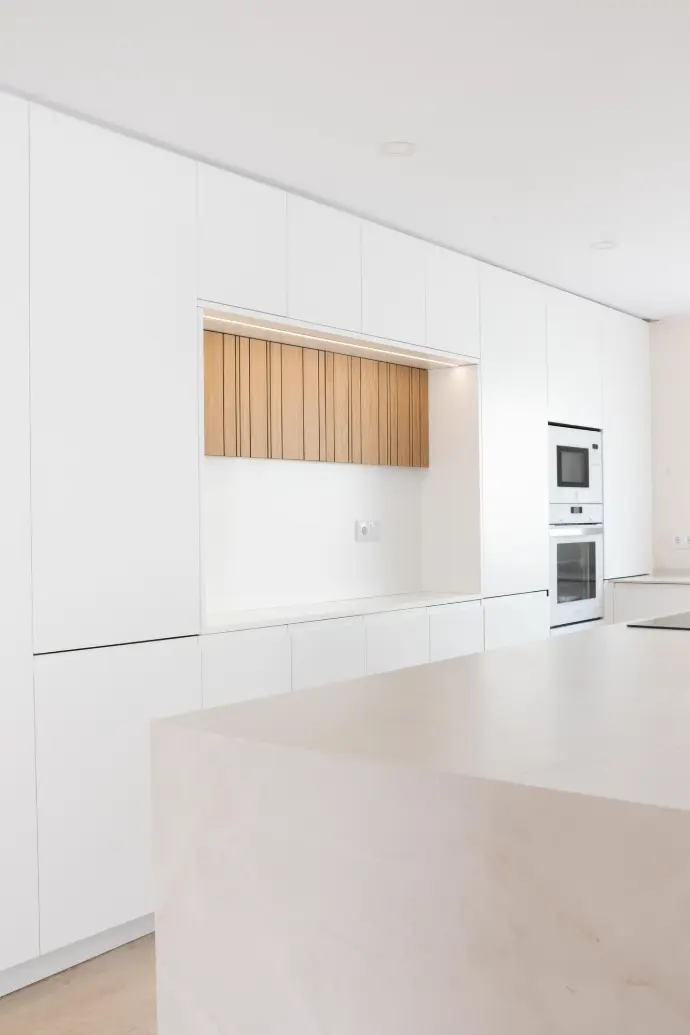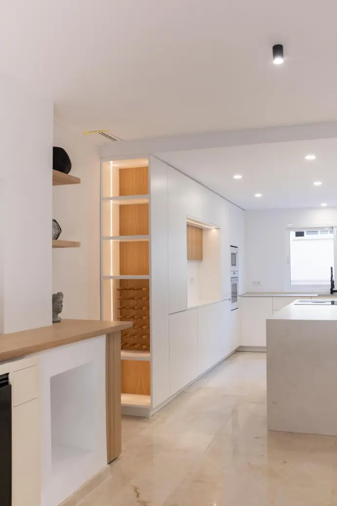 Detalles como la isla de cocina con su revestimiento de lamas, las lámparas colgantes de diseño minimalista y el espejo semicircular del recibidor añaden un toque distintivo. El baño, con sus azulejos con textura y espejo retroiluminado, muestra una atención al detalle que eleva la experiencia. Es un hogar donde cada elemento ha sido escogido para crear un ambiente armonioso, práctico y lleno de estilo.