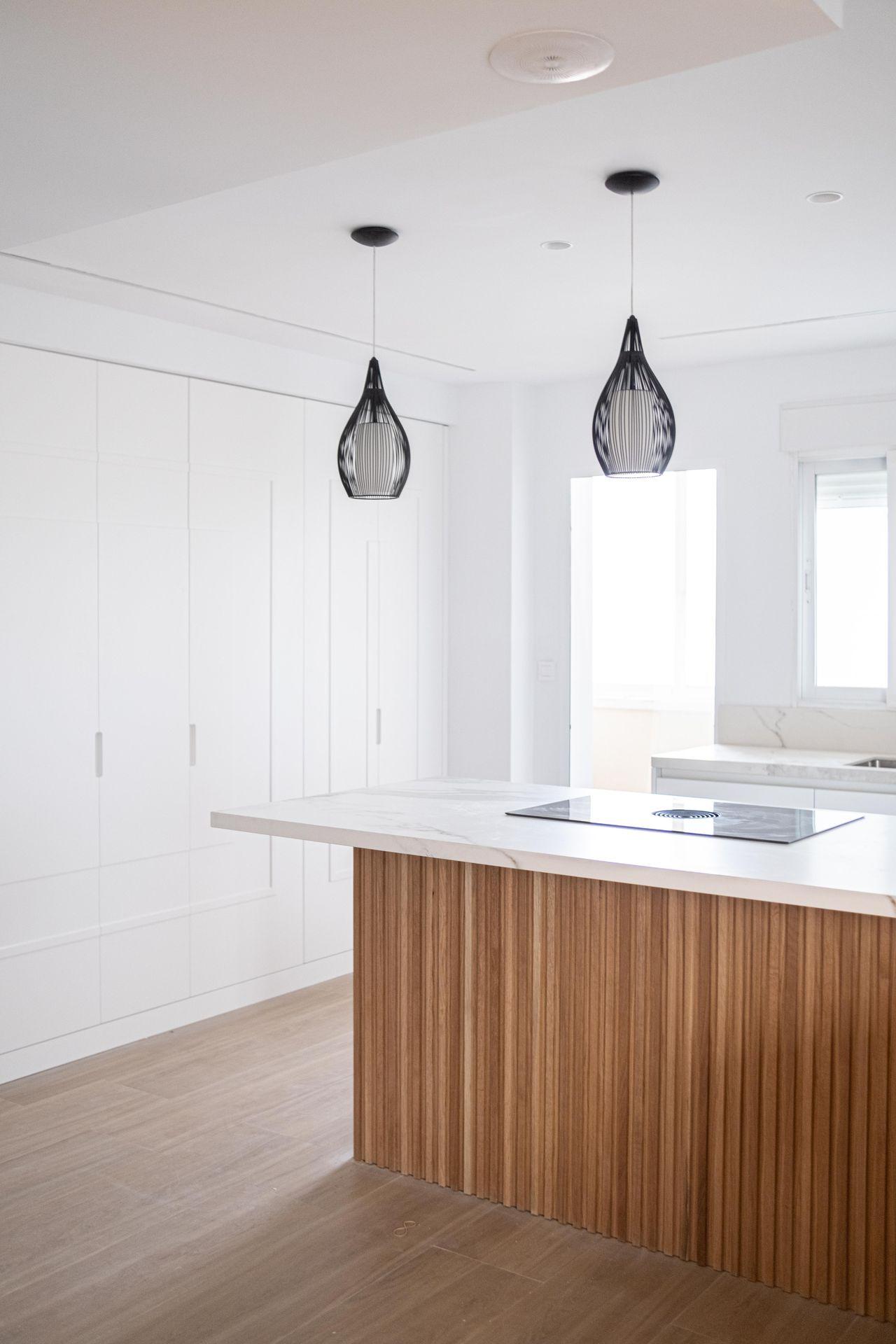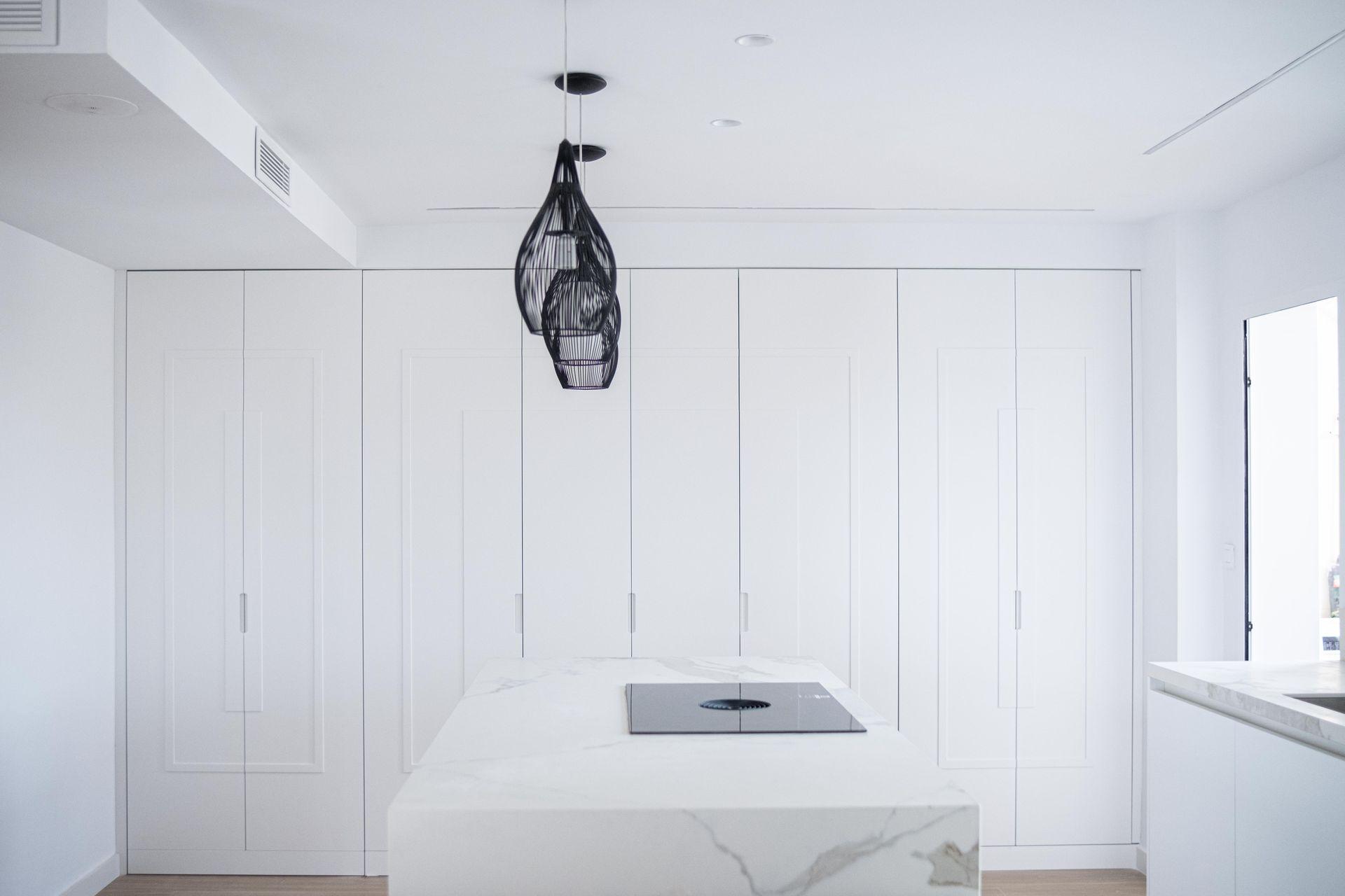 La cocina se integra de forma fluida, con una isla central de mármol que se convierte en pieza clave. Este hogar, concebido para el confort, fusiona la funcionalidad contemporánea con una estética atemporal, invitando a la calma en cada rincón.